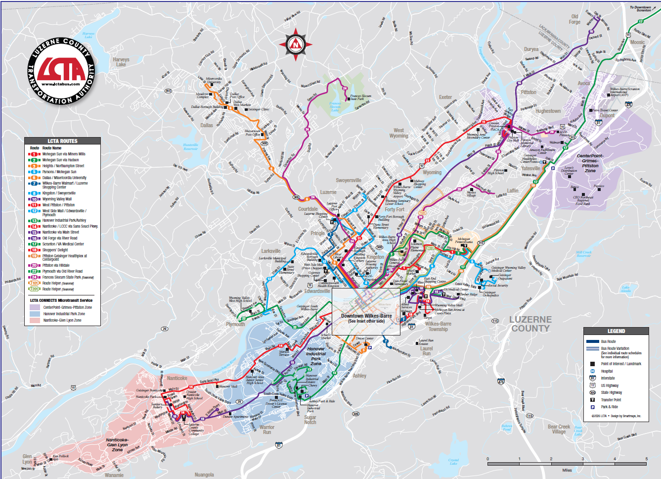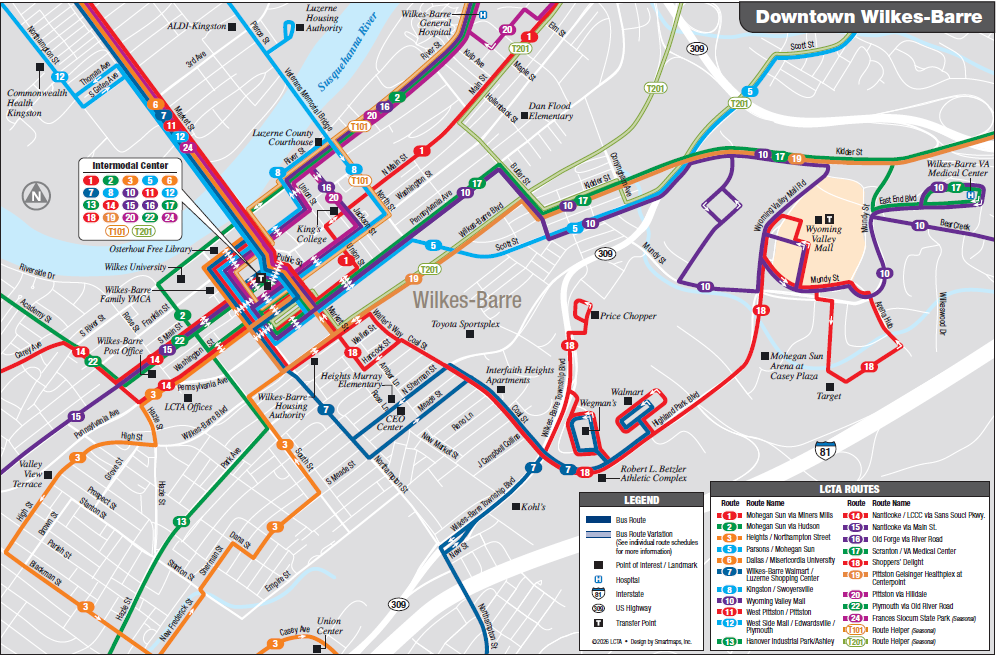 To obtain an LCTA System Map, you can call LCTA at 570-288-9356 or email contactus@lctabus.com to have one mailed to you, or pick one up at the main office at 300 S. Pennsylvania Ave or the Intermodal Transit Center at 47 S. Washington St.